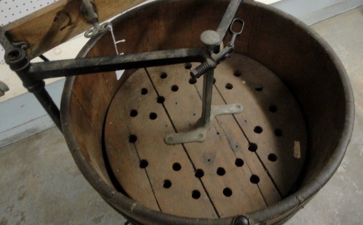 Шесть минут, по часам, и ваше грязное бельё безупречно чисто! При этом вы затратите лишь десятую долю усилий по сравнению с любым другим способом стирки. В свое время Гравитационная Стиральная машина считалась трудосберегающим устройством! Очень простой, но эффективный механизм, находящийся под барабаном, обеспечивал возвратно-поступательное движение вперед и назад, вызывая при этом вертикальное движение барабана вверх и вниз. Источником энергии, как правило, была домохозяйка. Оператор сидел рядом с машиной и, используя ручку, находящуюся сбоку барабана, вращал барабан туда-сюда. Если бы вы исследовали движение воды по мере ее циркуляции через бельё в баке, вы бы не увидели большой разницы по сравнению с современной машиной.
